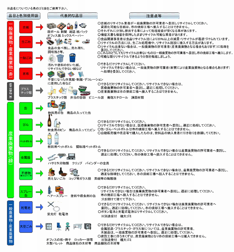 ・一斗缶、発泡スチロールの内容物は空にして下さい。(油、生ゴミ、おがくず等)・蛍光灯の棒状の物、発泡スチロール、カサが多数排出される場合は、テープやひもで束ねて下さい。